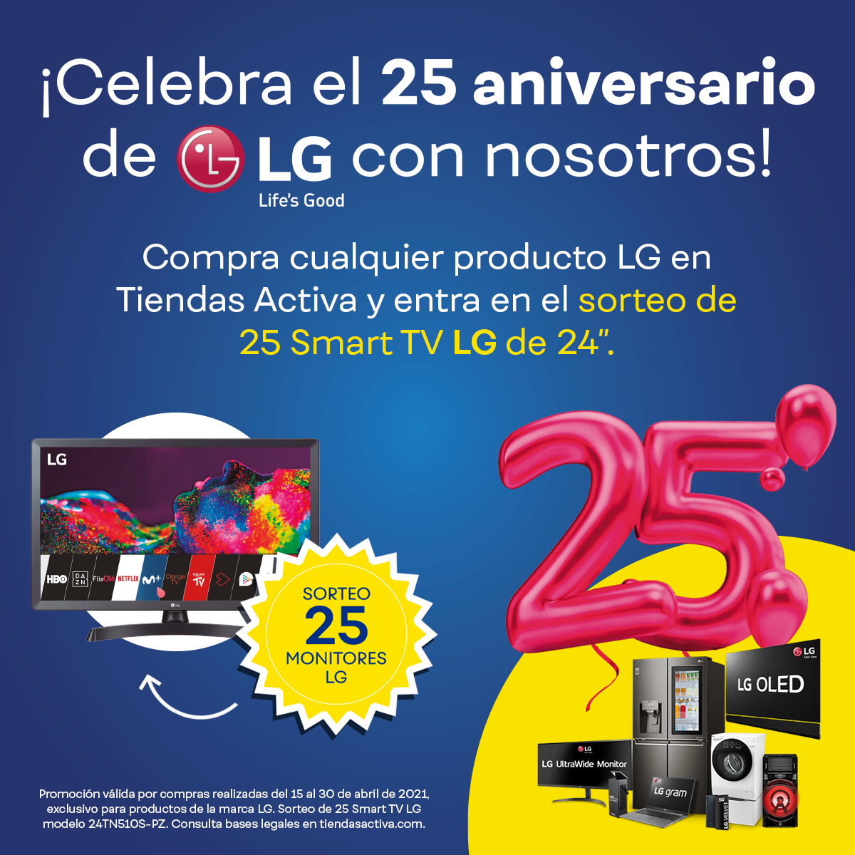 LG está de aniversario y en Tiendas Activa queremos celebrar a lo grande su 25 cumpleaños con un gran sorteo. Ahora, por la compra de cualquier producto de LG en nuestras tiendas físicas o en sur.tiendasactiva.com, participarás en el sorteo de 25 televisores LG TV Smart Modelo 24TN510S-PZ.