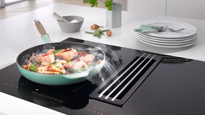 TwoInOne es la primera placa de inducción de Miele con sistema de extracción integrado. Cuenta con un innovador sistema de extracción automático combinado por primera vez con las exclusivas zonas de inducción PowerFlex.